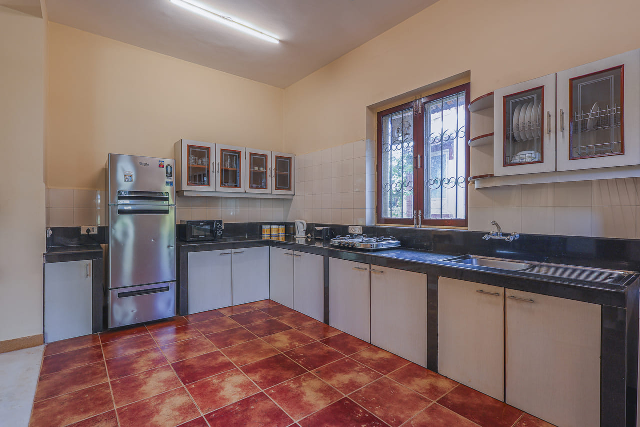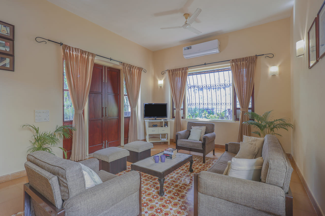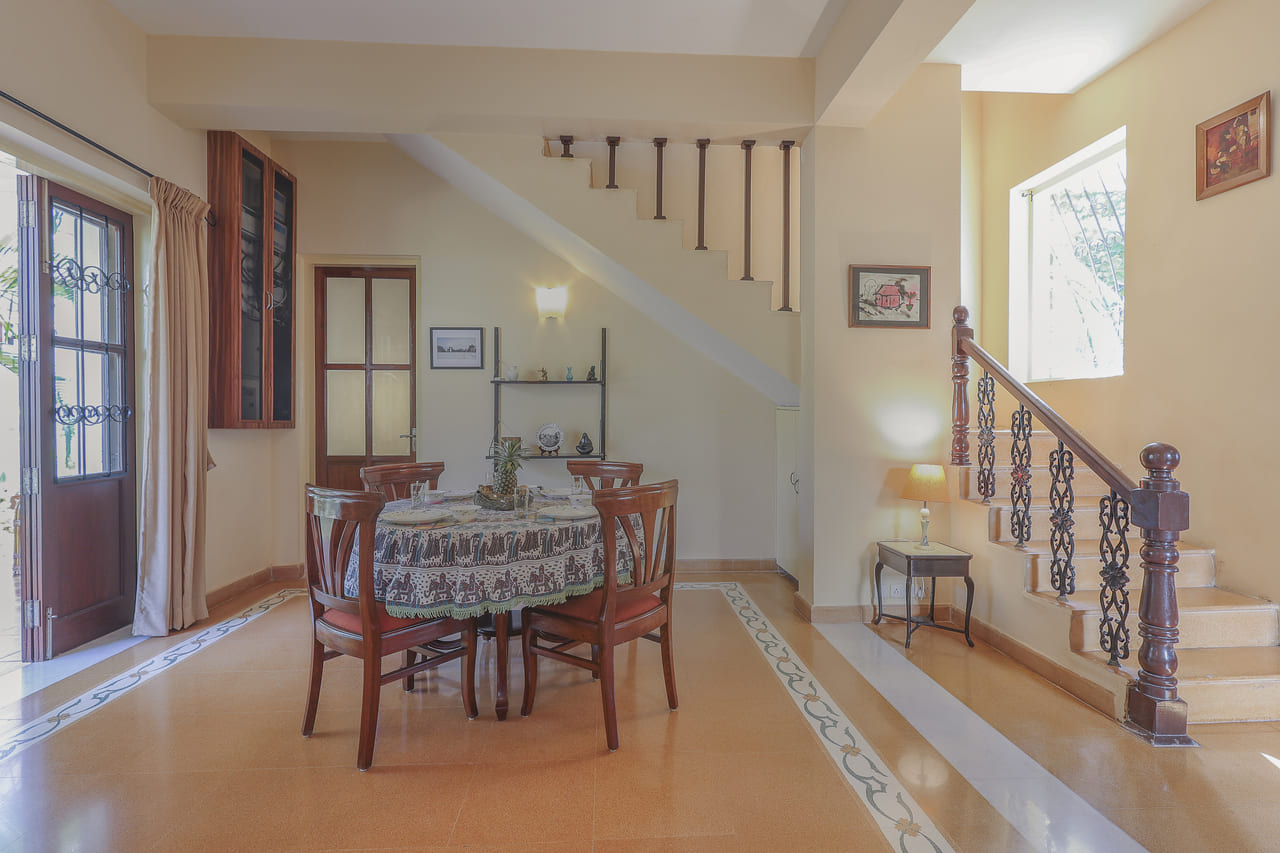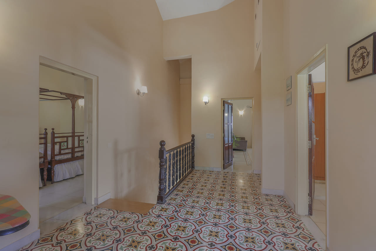 A four bedroom bungalow in the beautiful village of Cavelossim in south Goa, ideal for a family or group of friends, who want to relax and spend quality time together. The house is in modern Goan style with Portuguese tiles adding to the local flavour. One bedroom is on the ground level and three are on the first floor. If you like to cook, you will love the huge kitchen area. The living room is large too and the master bedroom has a balcony attached overlooking the garden area. There is also a fridge, washing machine, 32 inch flatscreen TV in the living room and ample parking for your convenience.