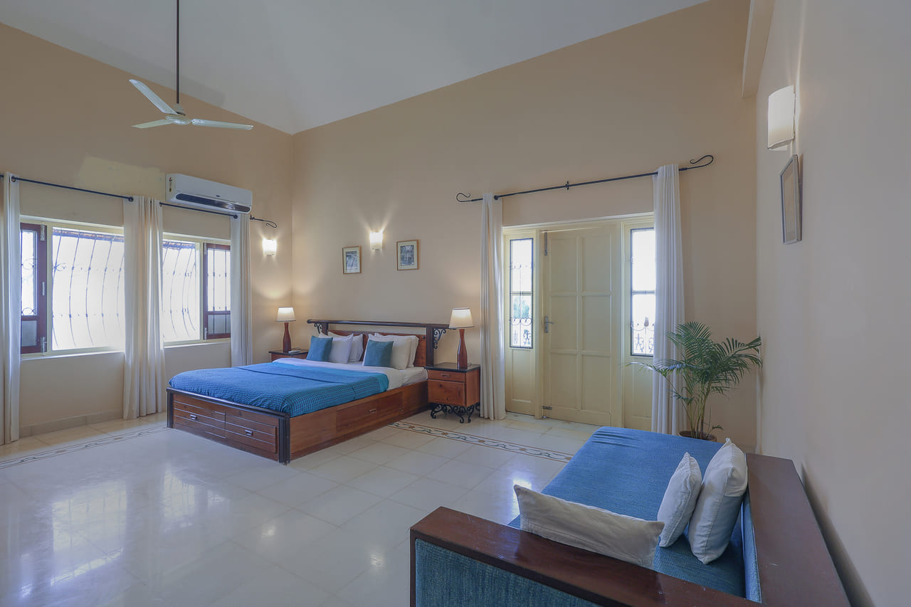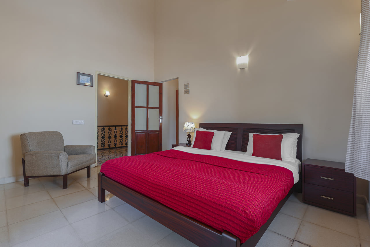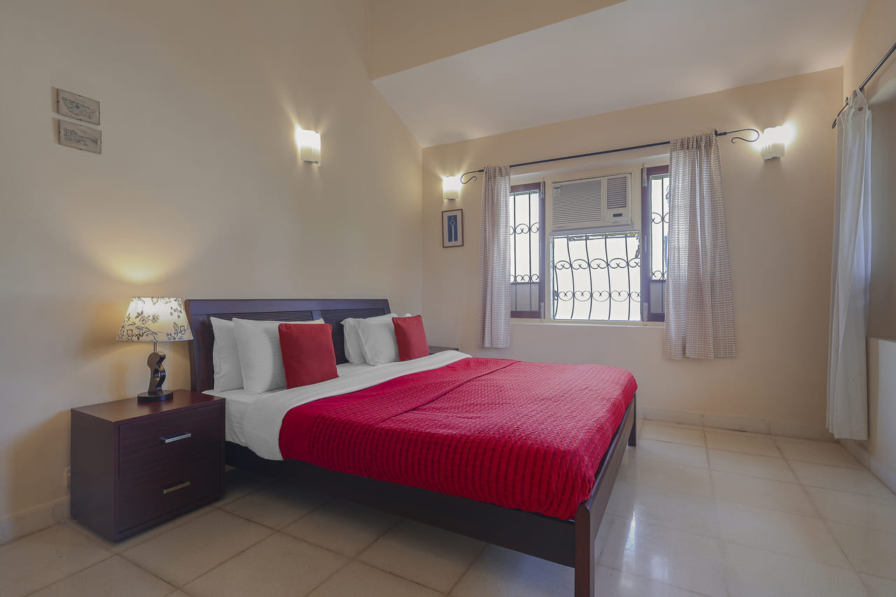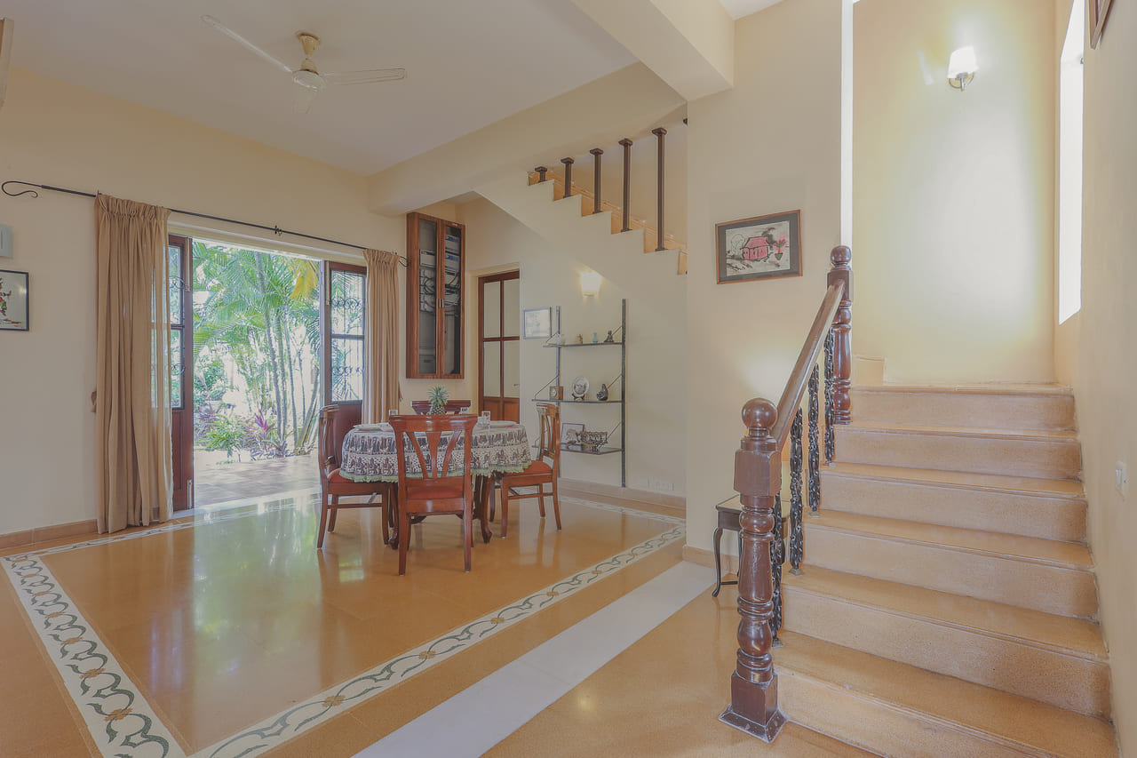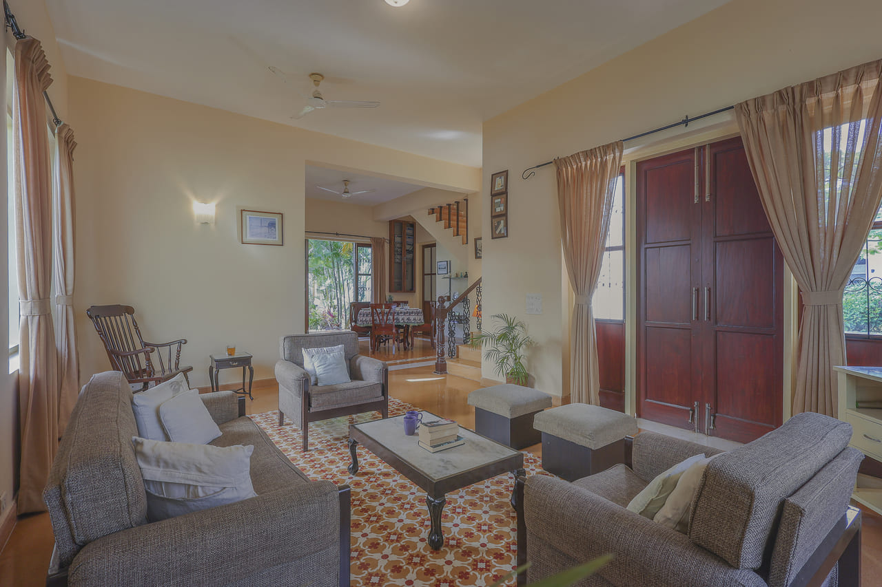 A four bedroom bungalow in the beautiful village of Cavelossim in south Goa, ideal for a family or group of friends, who want to relax and spend quality time together. The house is in modern Goan style with Portuguese tiles adding to the local flavour. One bedroom is on the ground level and three are on the first floor. If you like to cook, you will love the huge kitchen area. The living room is large too and the master bedroom has a balcony attached overlooking the garden area. There is also a fridge, washing machine, 32 inch flatscreen TV in the living room and ample parking for your convenience.
