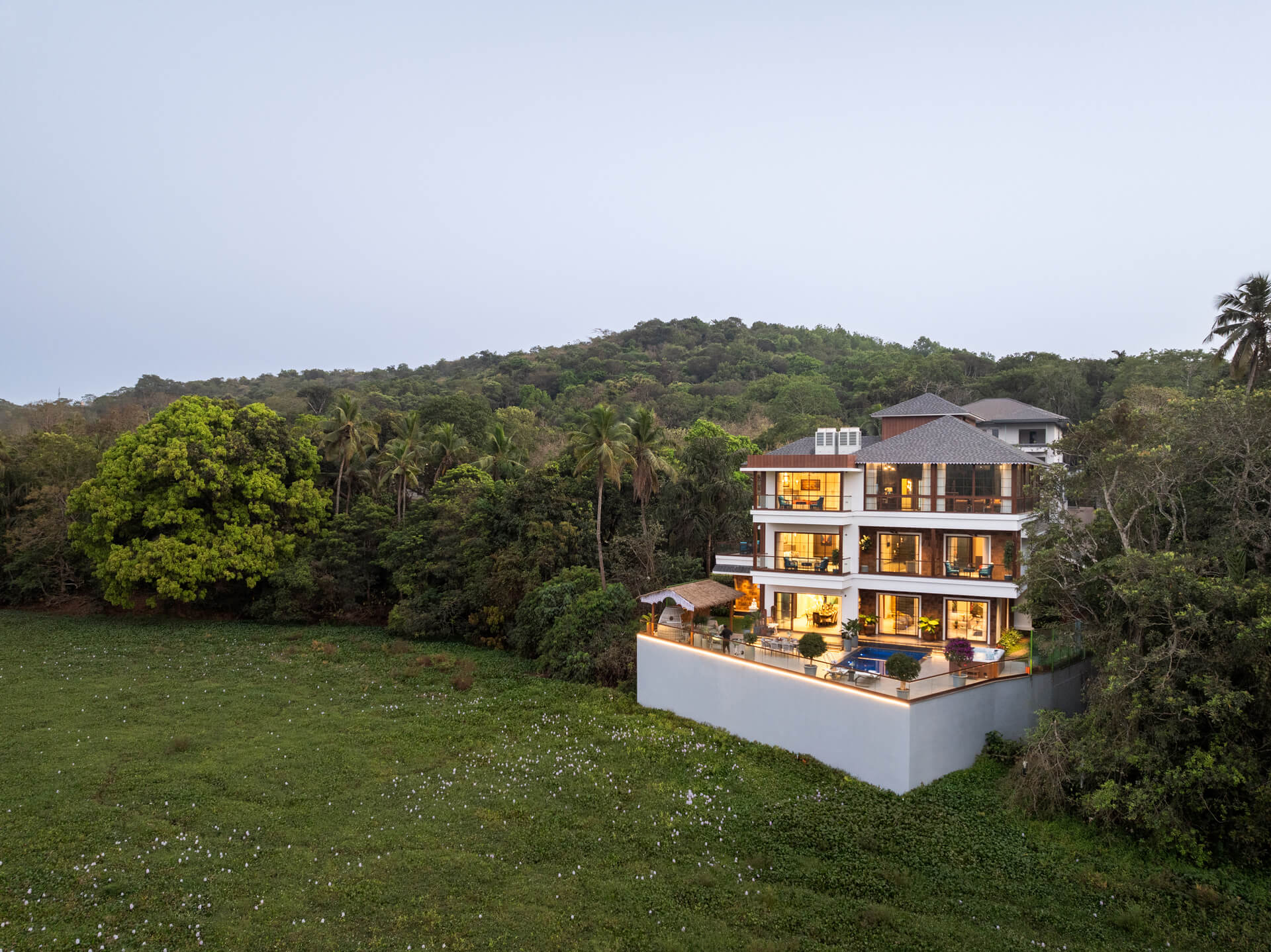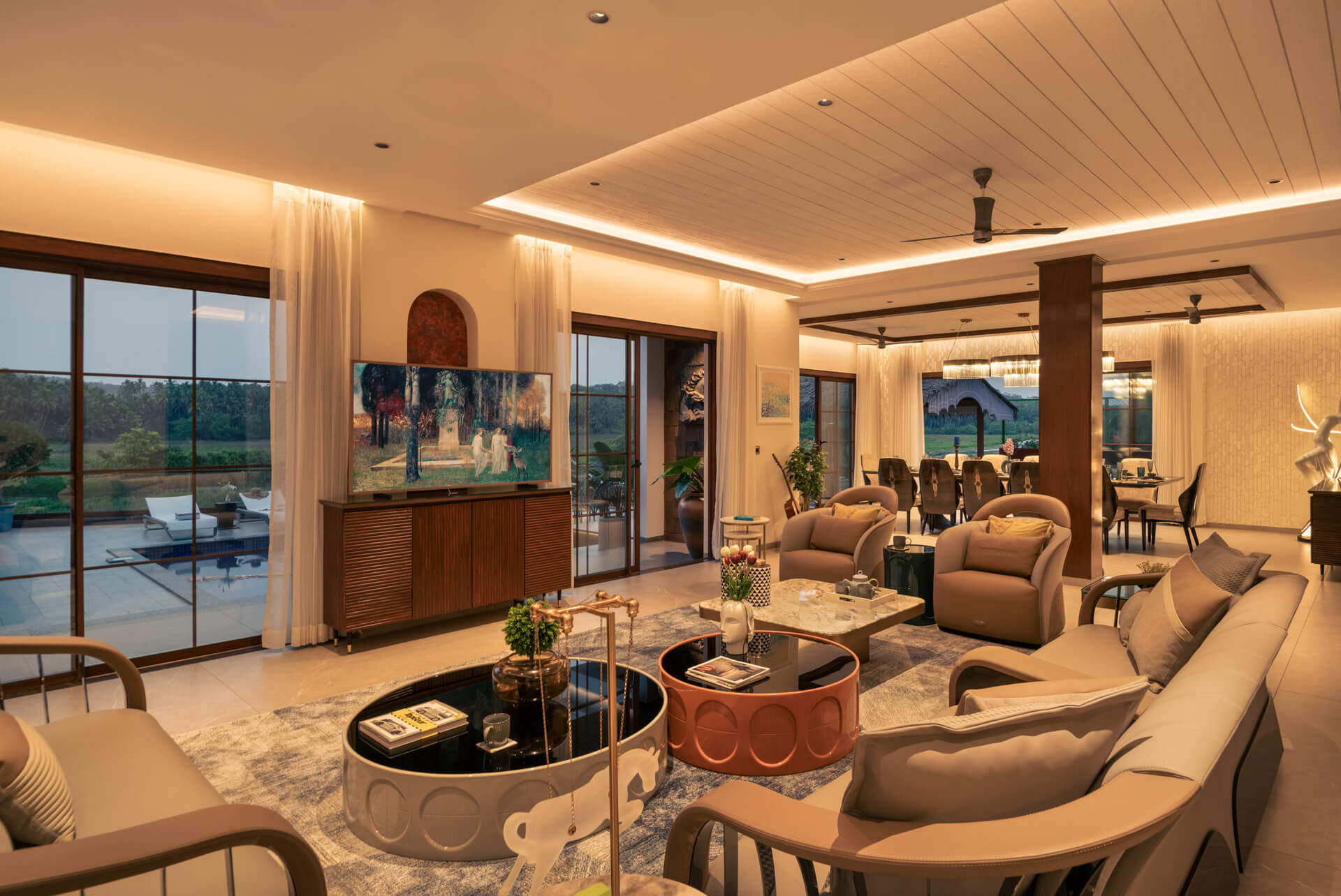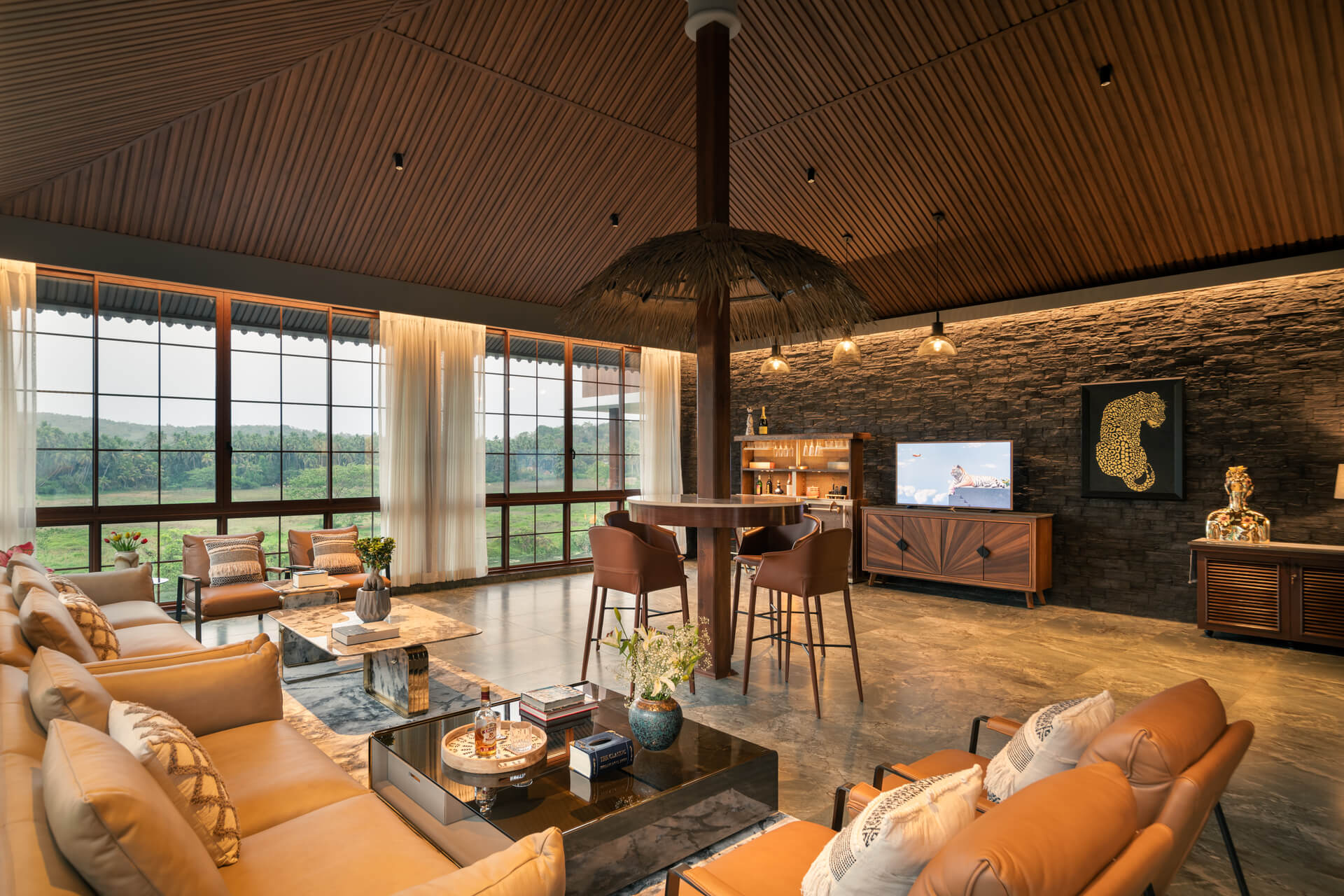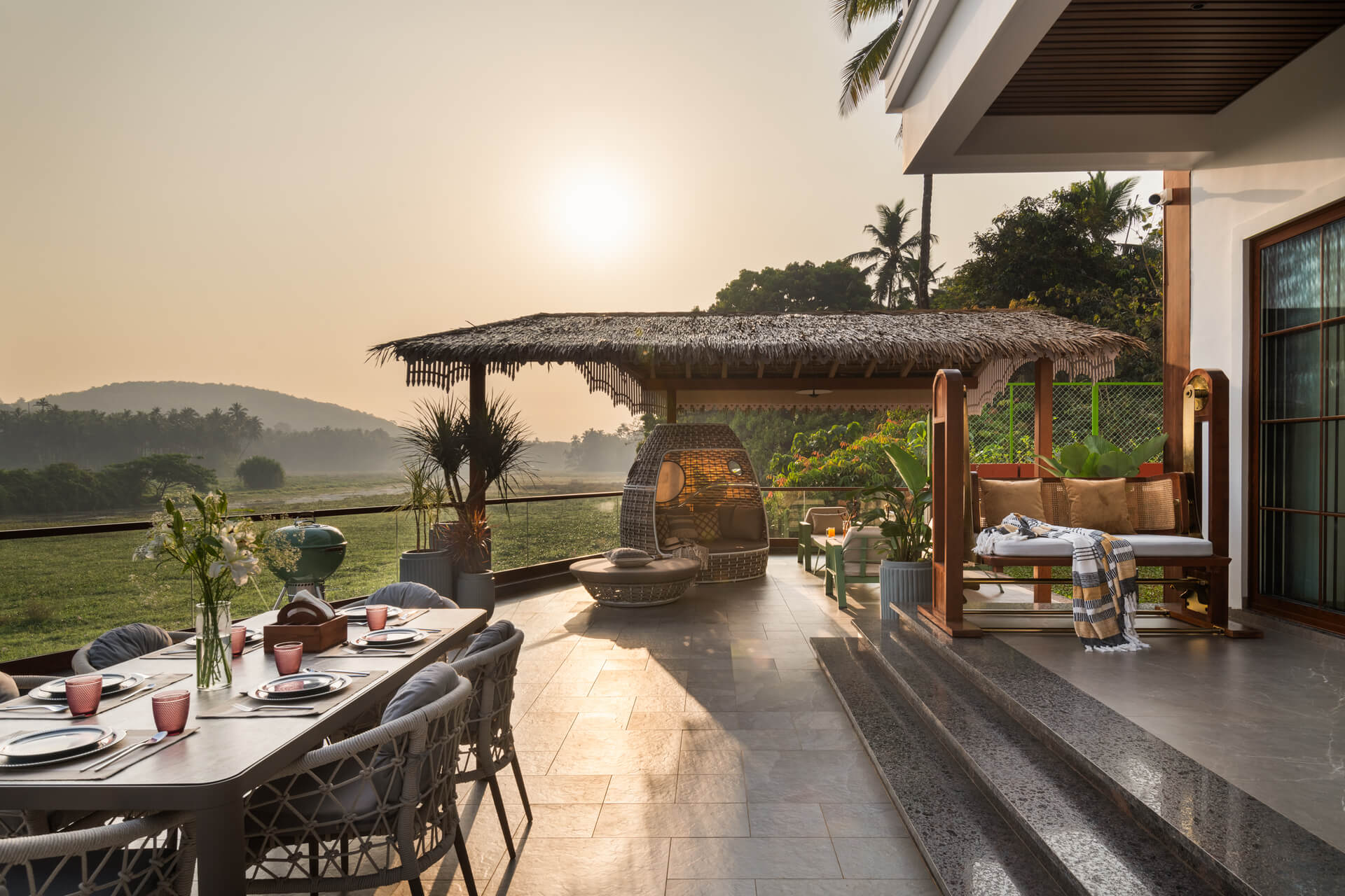 All rooms including the living/drawing room have the 50” SMART LED TV for full-swing entertainment, the living room has comfortable furniture from the Swedish Ikea brand, one of them is the 3 and 4-seat sofa wherein one can sit and sleep, and the living room is apt for having fun and socializing. Additionally, there are a bunch of gazebos on the deck of the swimming pool under which one can rest in hammocks.