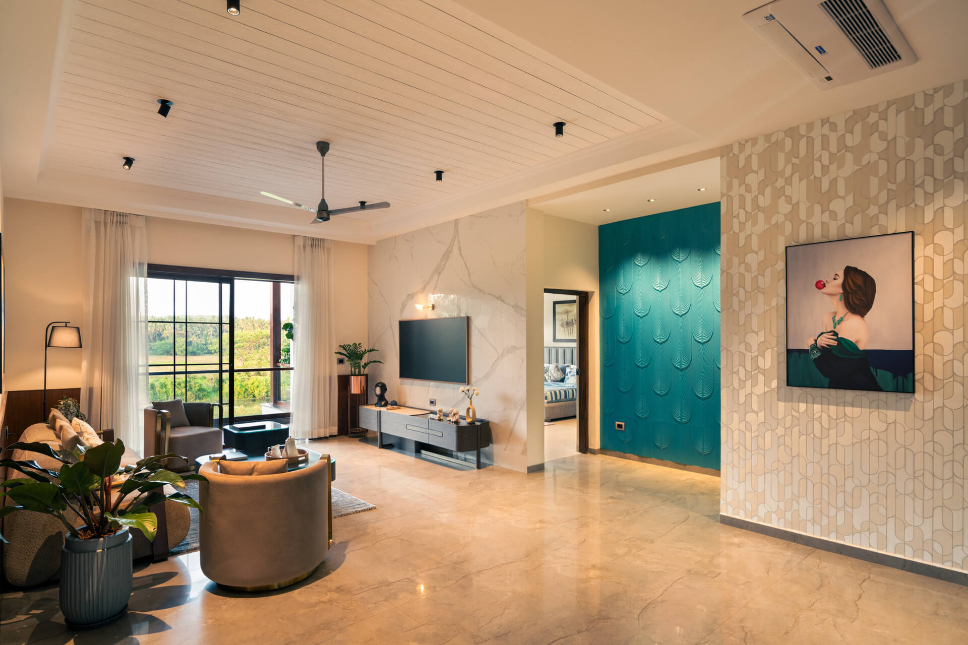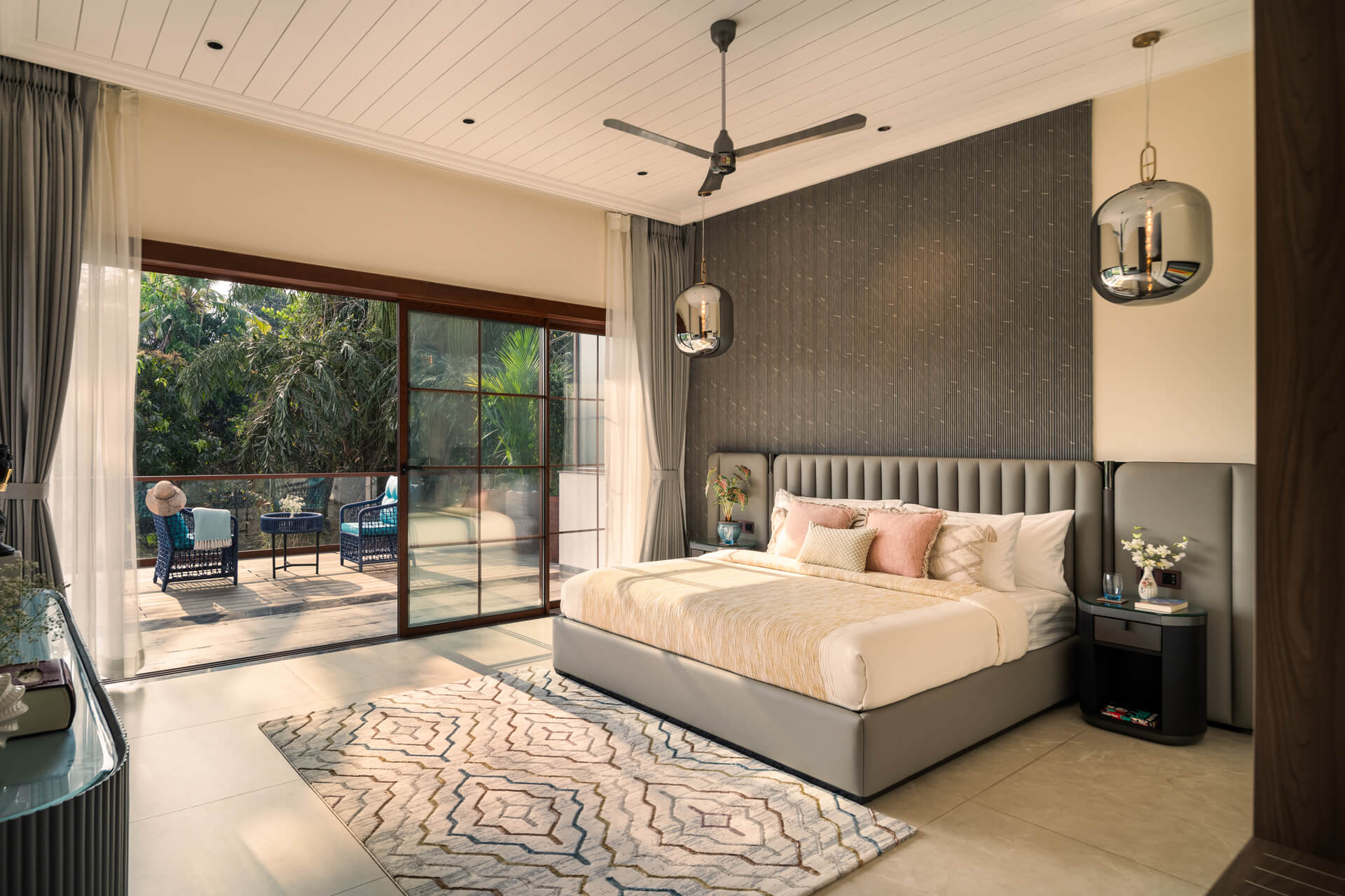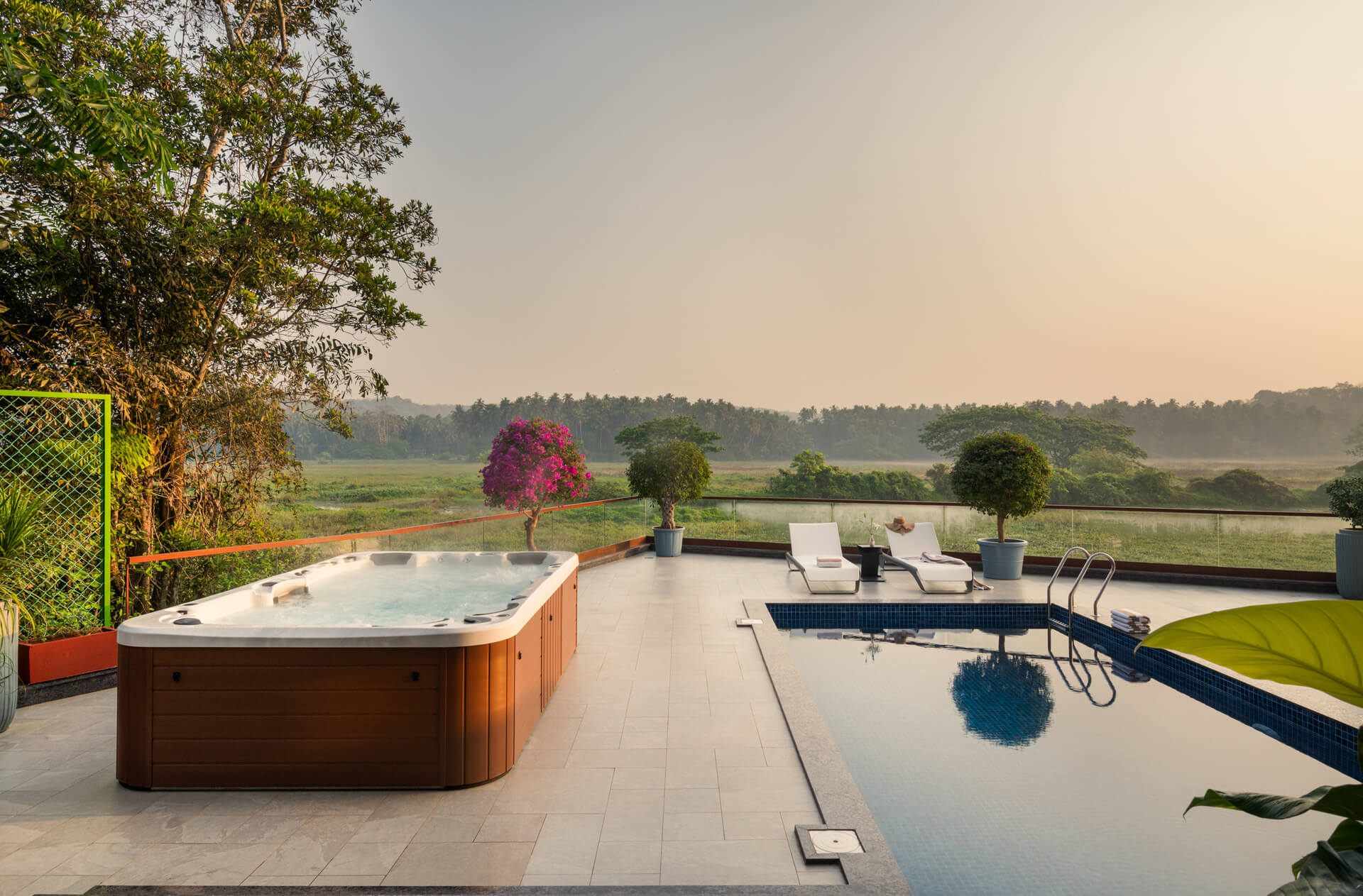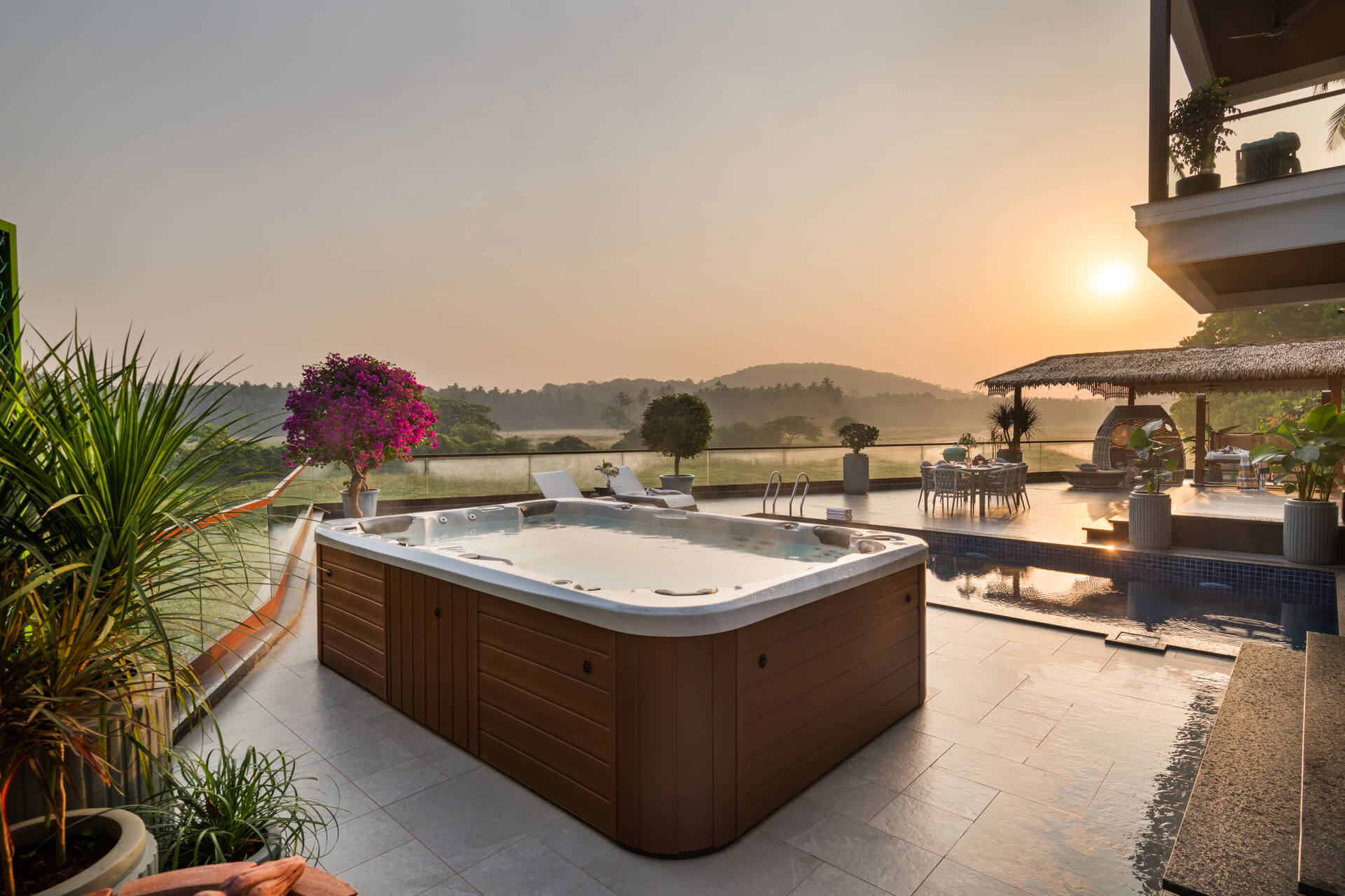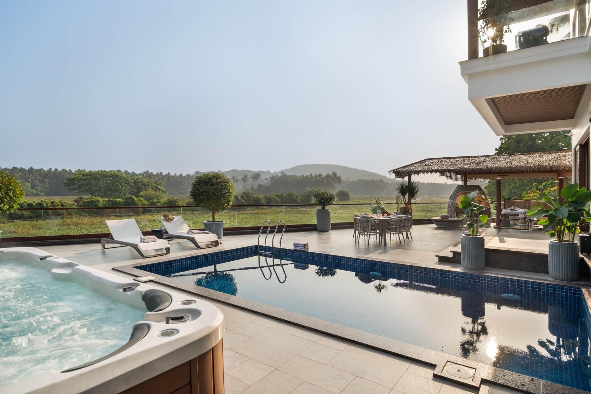 All rooms including the living/drawing room have the 50” SMART LED TV for full-swing entertainment, the living room has comfortable furniture from the Swedish Ikea brand, one of them is the 3 and 4-seat sofa wherein one can sit and sleep, and the living room is apt for having fun and socializing. Additionally, there are a bunch of gazebos on the deck of the swimming pool under which one can rest in hammocks.