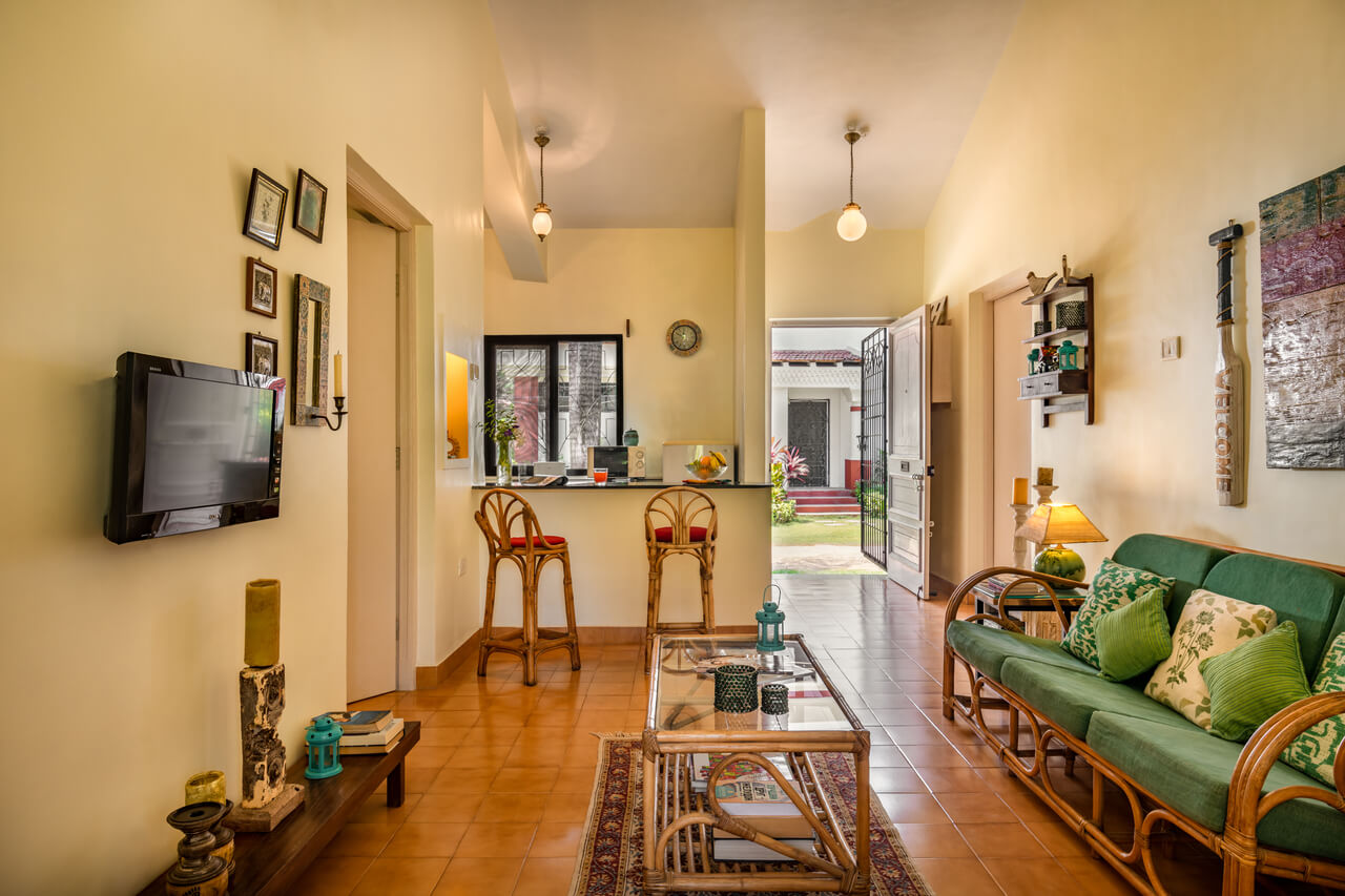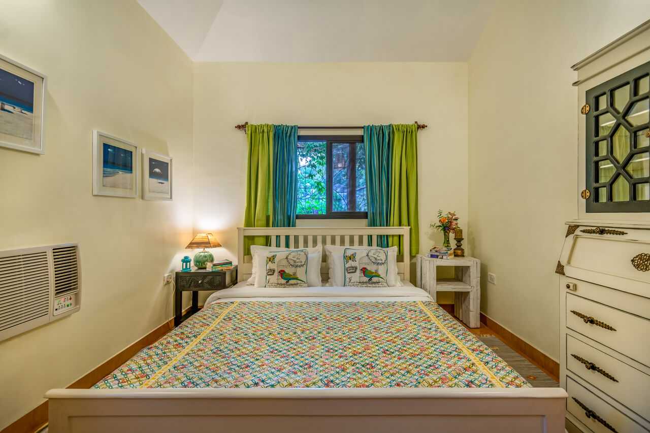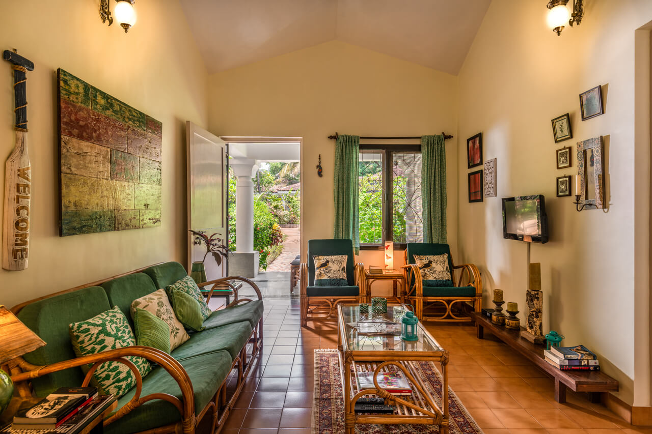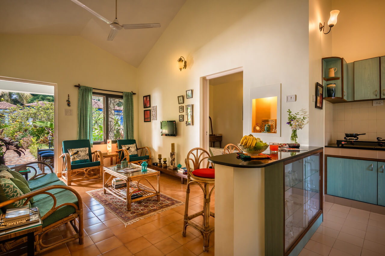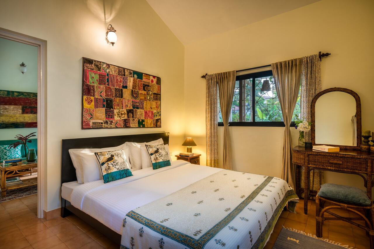 A cozy two bedroom cottage in the landmark Luisa by the Sea complex near Cavelossim Beach in south Goa, which has two common pools for you to use. One bedroom has a double bed and the other has two single beds, ideal for a family. A bathroom is attached to each of the bedrooms. There is a kitchenette and living room with a washing machine, ACs and TVs in every room. The back porch has a view of a pool with a hammock chair and outdoor table and chairs for lounging on your holiday. The decor has an ethnic and folk appeal to it with embroidery artwork, cane finish closets and cane furniture, adding to the homely atmosphere.