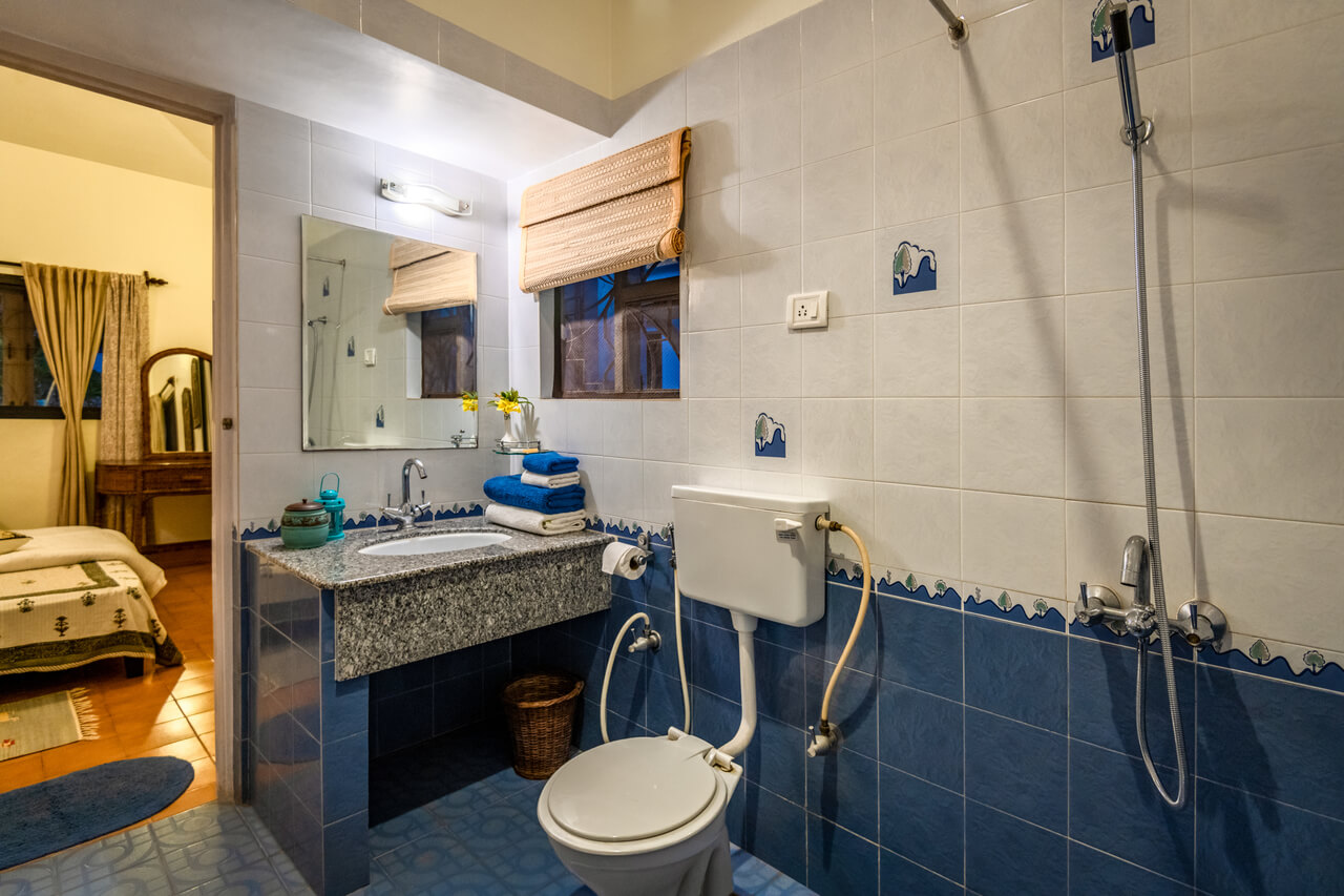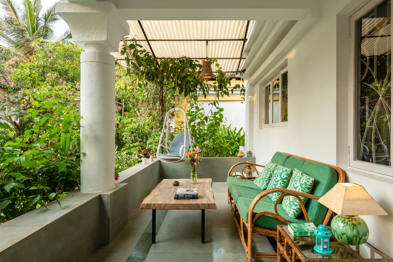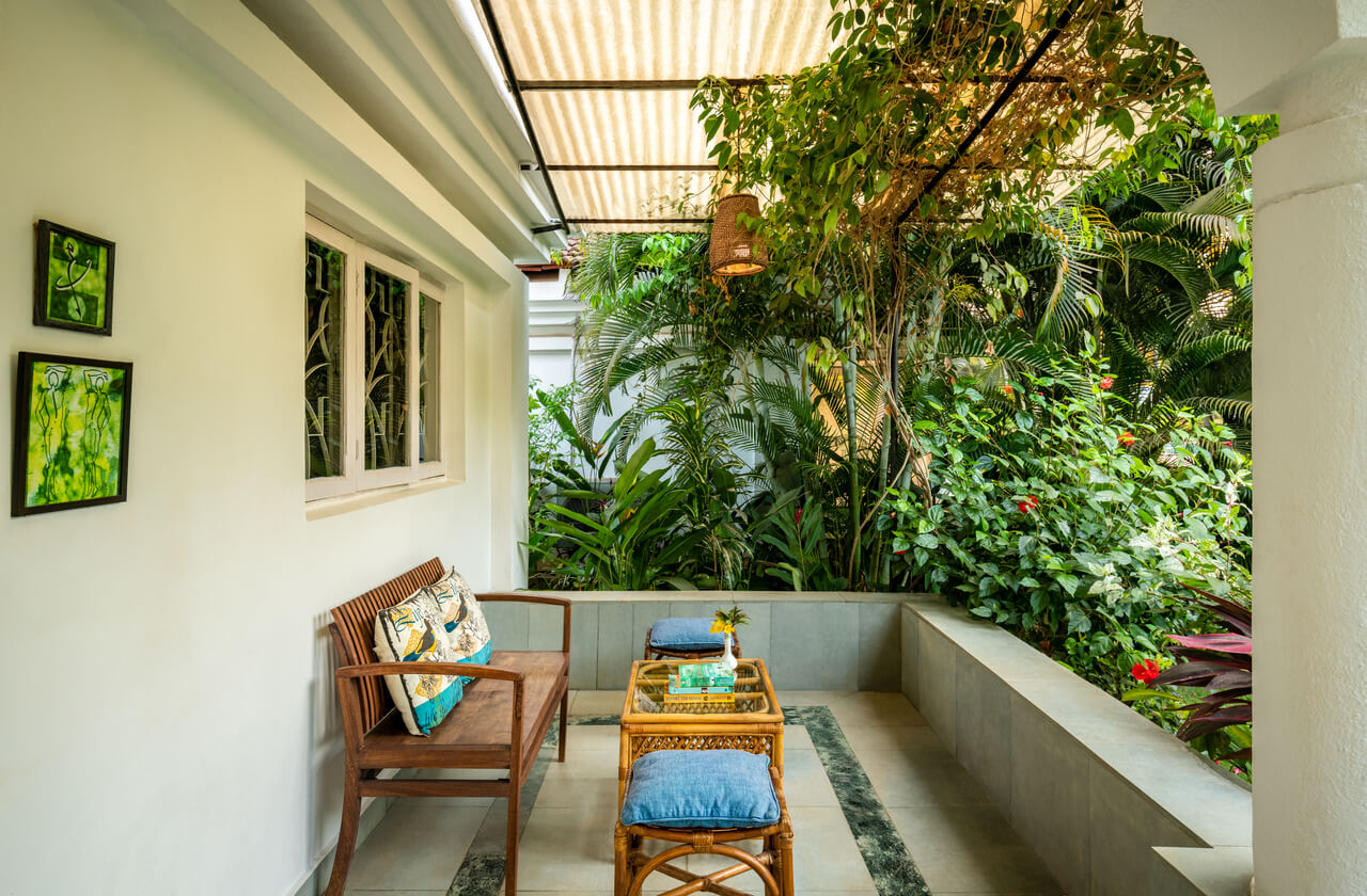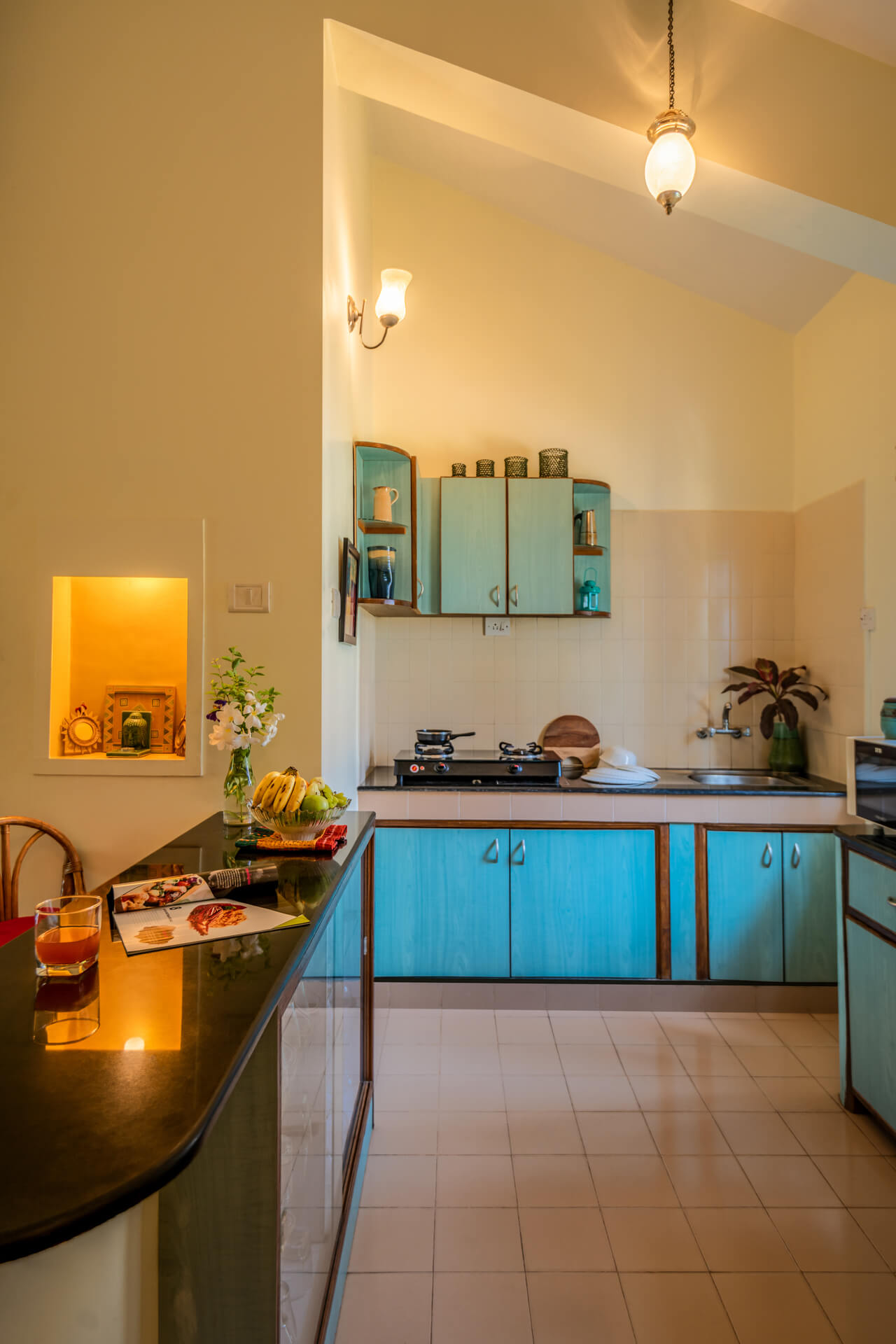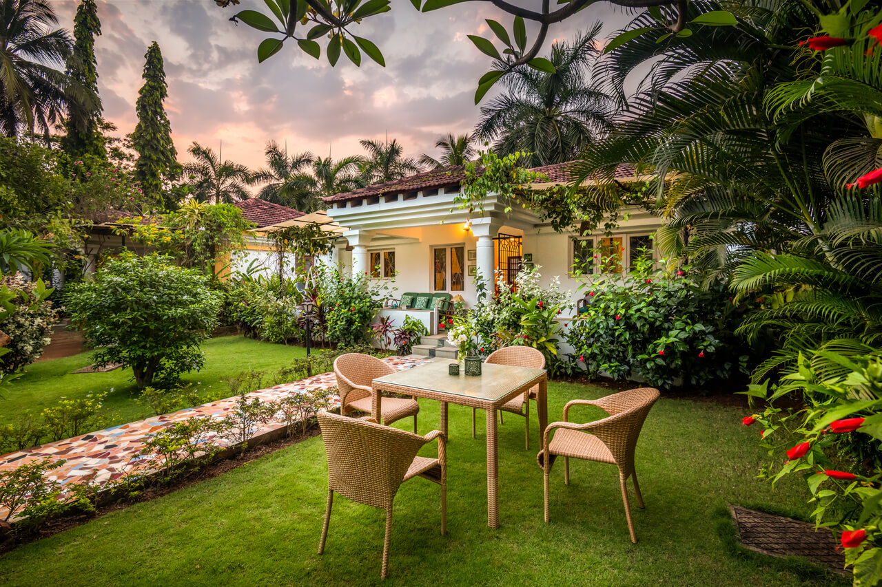 A cozy two bedroom cottage in the landmark Luisa by the Sea complex near Cavelossim Beach in south Goa, which has two common pools for you to use. One bedroom has a double bed and the other has two single beds, ideal for a family. A bathroom is attached to each of the bedrooms. There is a kitchenette and living room with a washing machine, ACs and TVs in every room. The back porch has a view of a pool with a hammock chair and outdoor table and chairs for lounging on your holiday. The decor has an ethnic and folk appeal to it with embroidery artwork, cane finish closets and cane furniture, adding to the homely atmosphere.
